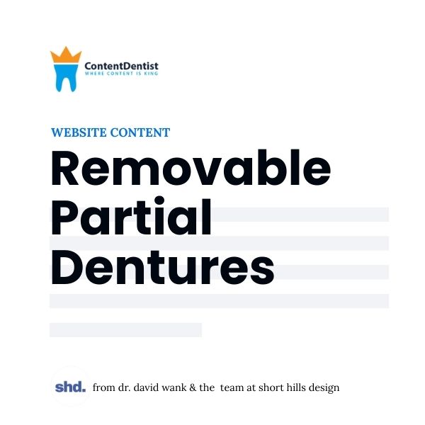 SEO-ready, expertly written Removable Partial Dentures content for your dental website. From Harvard-trained dentist, Dr. David Wank, use this content to drive more traffic and more new patients to your website. Copy, past and publish, or edit the content to make it more yours.